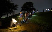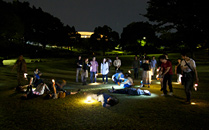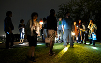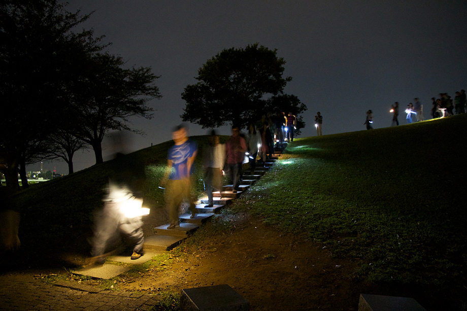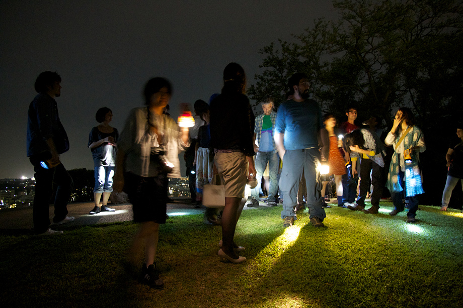For this task participants and I walked the streets at night, each of us carrying a flashlight. The venue, blanClass, is in the Yokohama district of Idogaya, a particularly hilly part of town. Leaving blanClass around seven in the evening, we first of all climbed the hill behind the gallery, and looked down over the nighttime city from a slope in a pitch-dark park. Next we sprawled out spontaneously on a vacant lot, made our way through a long, narrow tunnel, found an old disused drinking fountain, and carried on through the nighttime residential neighborhood to the river. After walking for about an hour, we returned to blanClass, and had a drink while discussing our actions
