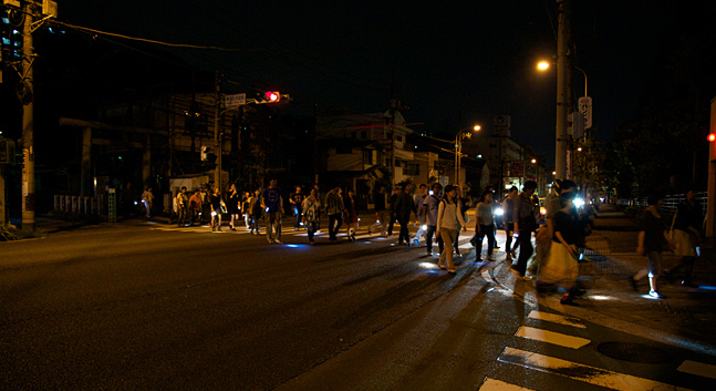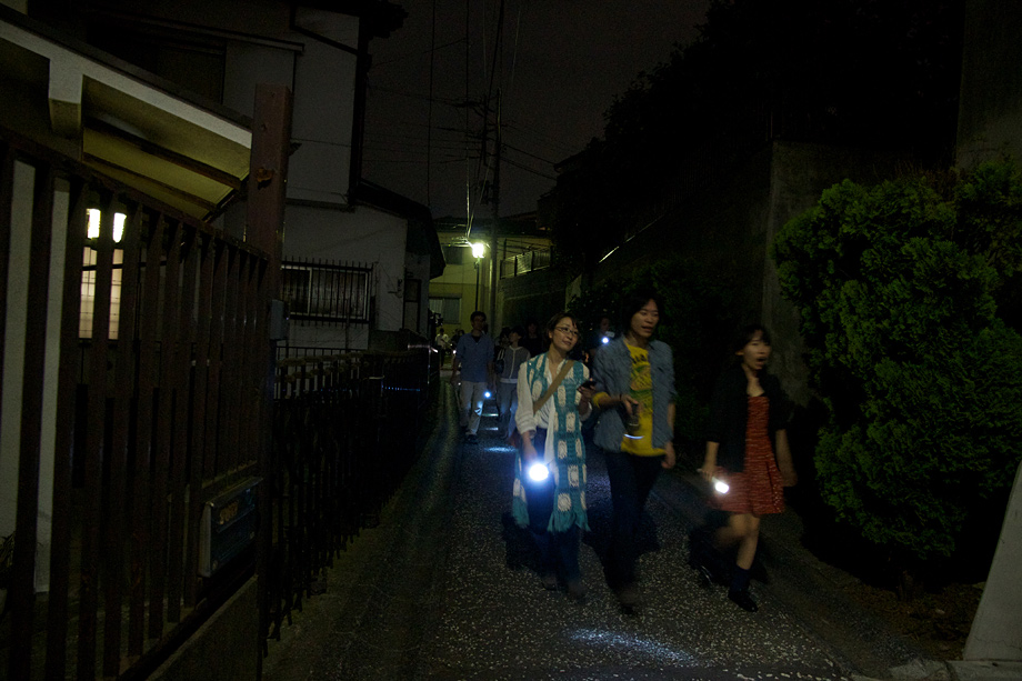 今回は参加者と共に夜の街を歩いた、各自懐中電灯を持ちながら。会場となったblanClassは横浜の井土ヶ谷という坂が多いエリアにある。夜7時ごろ、blanClassを出たぼくらはまず裏山に登り、真っ暗な公園にある小高い丘から夜の街を見下ろした。次いで広い原っぱで誰ともなく寝転がり、細くて長いトンネルを抜けて、かつて使われていた古い水飲み場を見つけ、そのまま川まで夜の住宅地を抜けた。約一時間ぐらいの間歩き続け、blanClassに戻り、飲み物を飲みながらその行為について話をした。